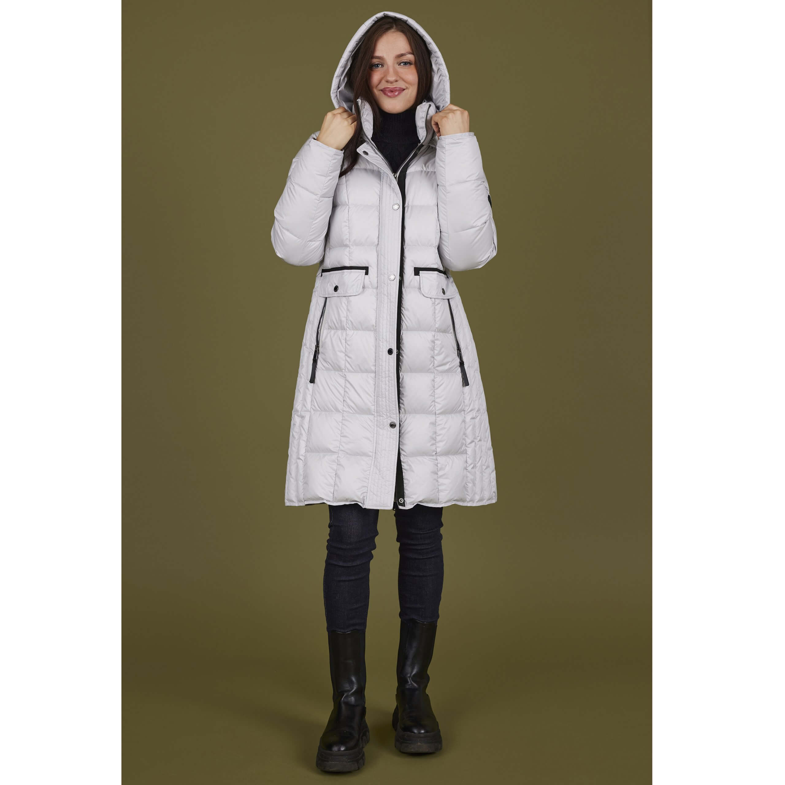 Wrap yourself in warmth and style with this quilted coat from the Normann collection. This longline coat features a high collar and full-length zipper offer extra protection against the cold, while the two oversized front pockets—trimmed in black and secured with button closures—add both function and flair.