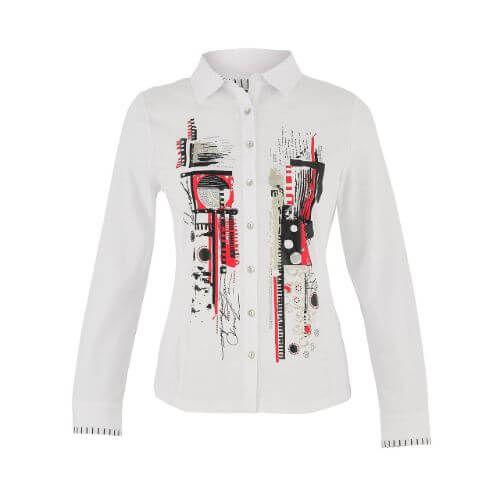 This Red & Black Print Shirt from the Dolcezza collection features a bold red and black artistic print, and unique button detail.