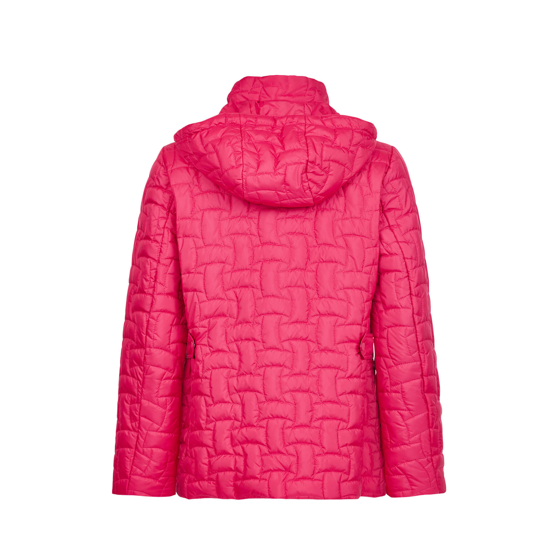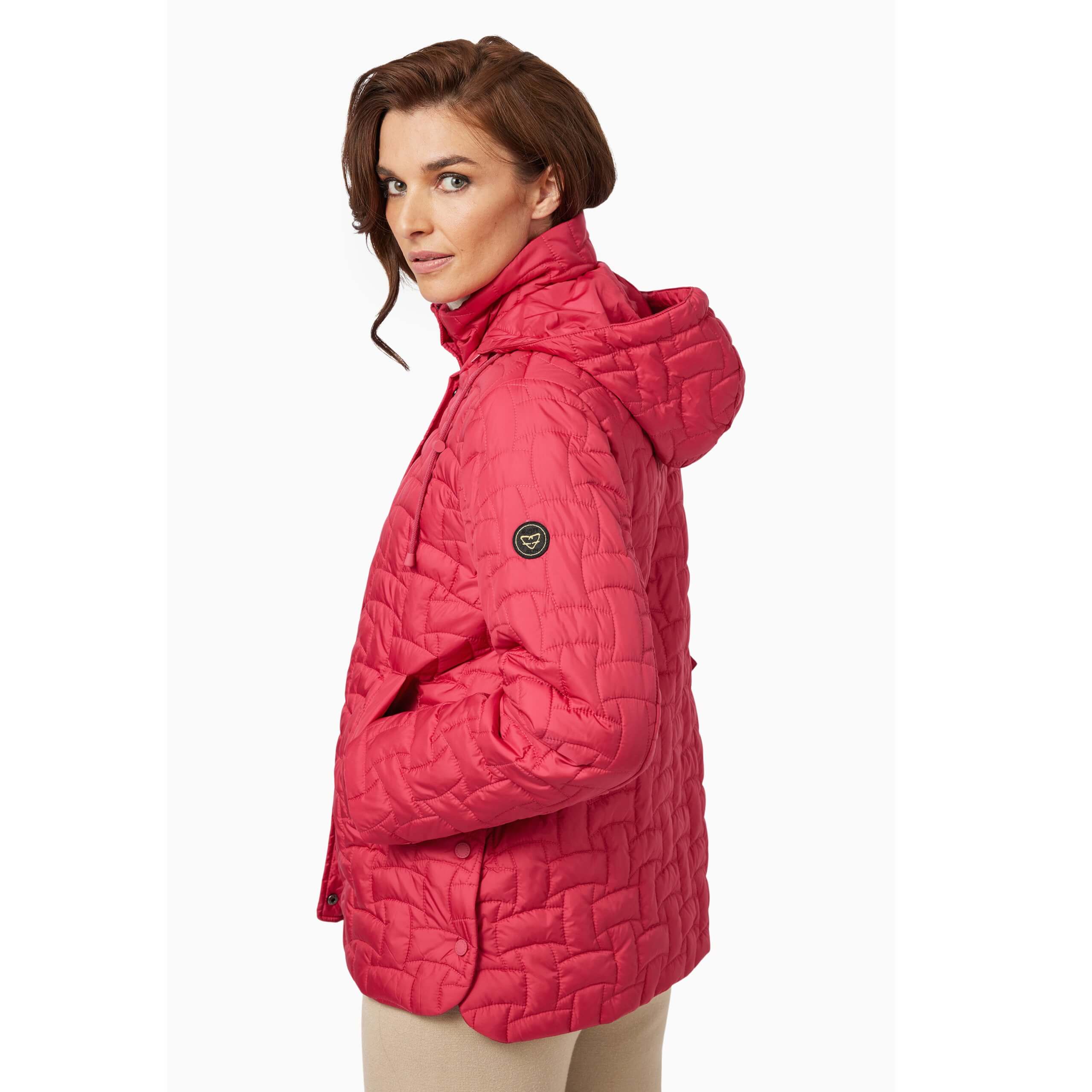 This Raspberry Quilted Hooded Jacket from the Frandsen collection features a unique quilt pattern , hood and a side button detail.