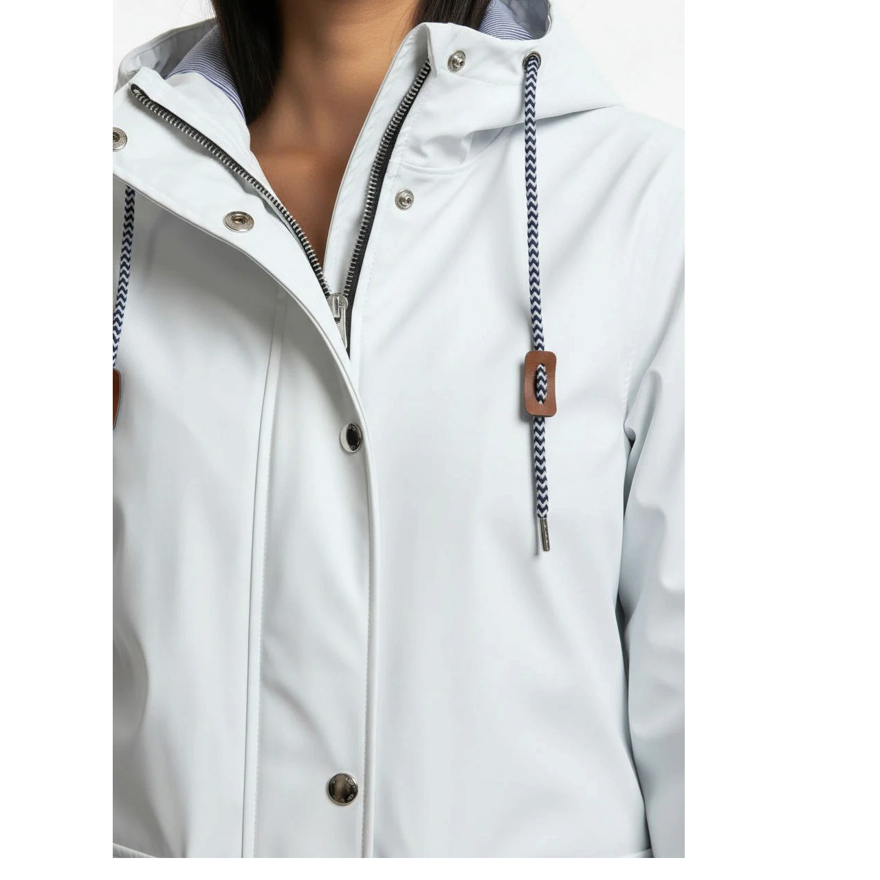 Embrace rainy days with confidence and style in the vibrant Hooded Raincoat. This relaxed-fit hooded raincoat features a straight silhouette, ensuring comfortable wear over layers. It boasts a hidden zip-front closure with a snap-button storm flap and two spacious patch pockets, perfect for essentials. The attached hood includes stylish navy and white chevron-patterned drawstrings with faux-leather sliders. Crafted from a smooth, matte, water-resistant material, this Marc Angelo coat offers lightweight protection. It’s fully lined with a crisp navy and white pinstripe fabric for added comfort. Ideal for unpredictable weather, this versatile raincoat pairs effortlessly with your favorite denim and rain boots for a chic, functional ensemble.