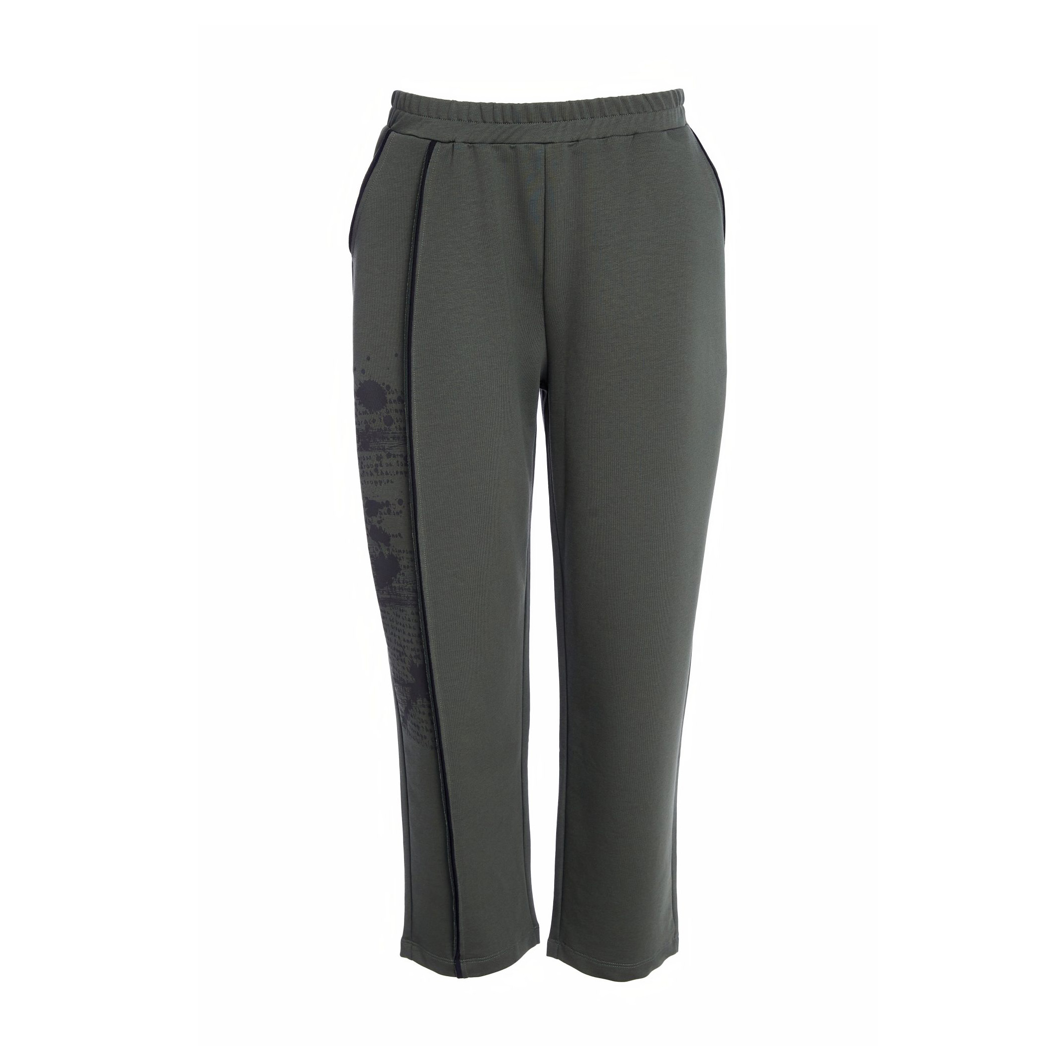 PRINT PLACEMENT; The NAYA slim leg jersey trousers have been brushed with a contrast print and vertical binding to one leg only. This thoughtful placement creates interest without distraction.