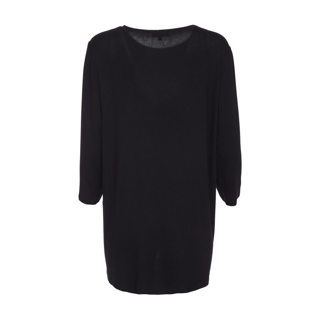 Embrace your shiny self with the long line jersey top from ORA, the mid to plus size brand. A base of black is lavished with a muted metallic silver tone in carefully placed panels to the bodice. The hem has also been glossed.