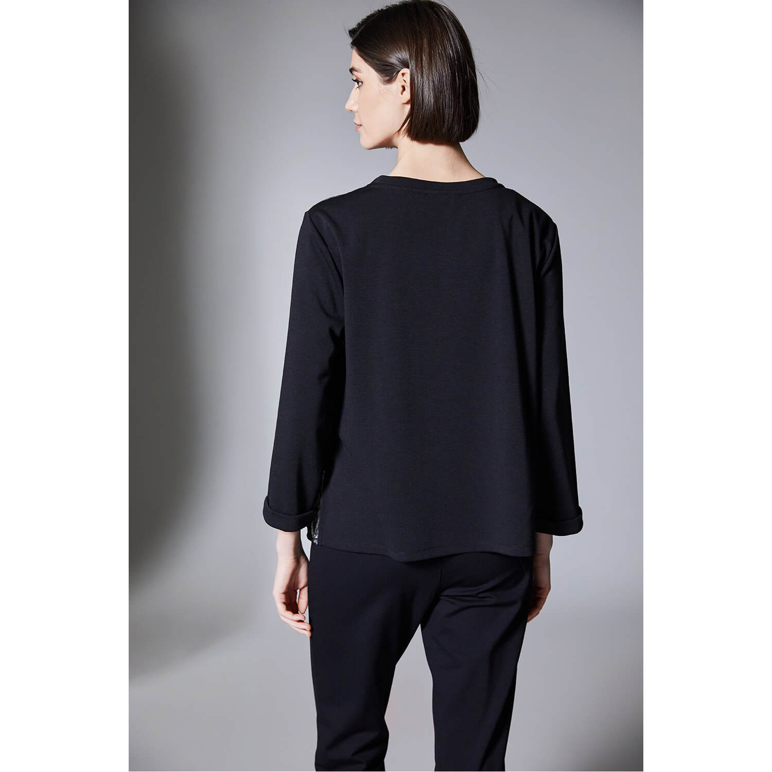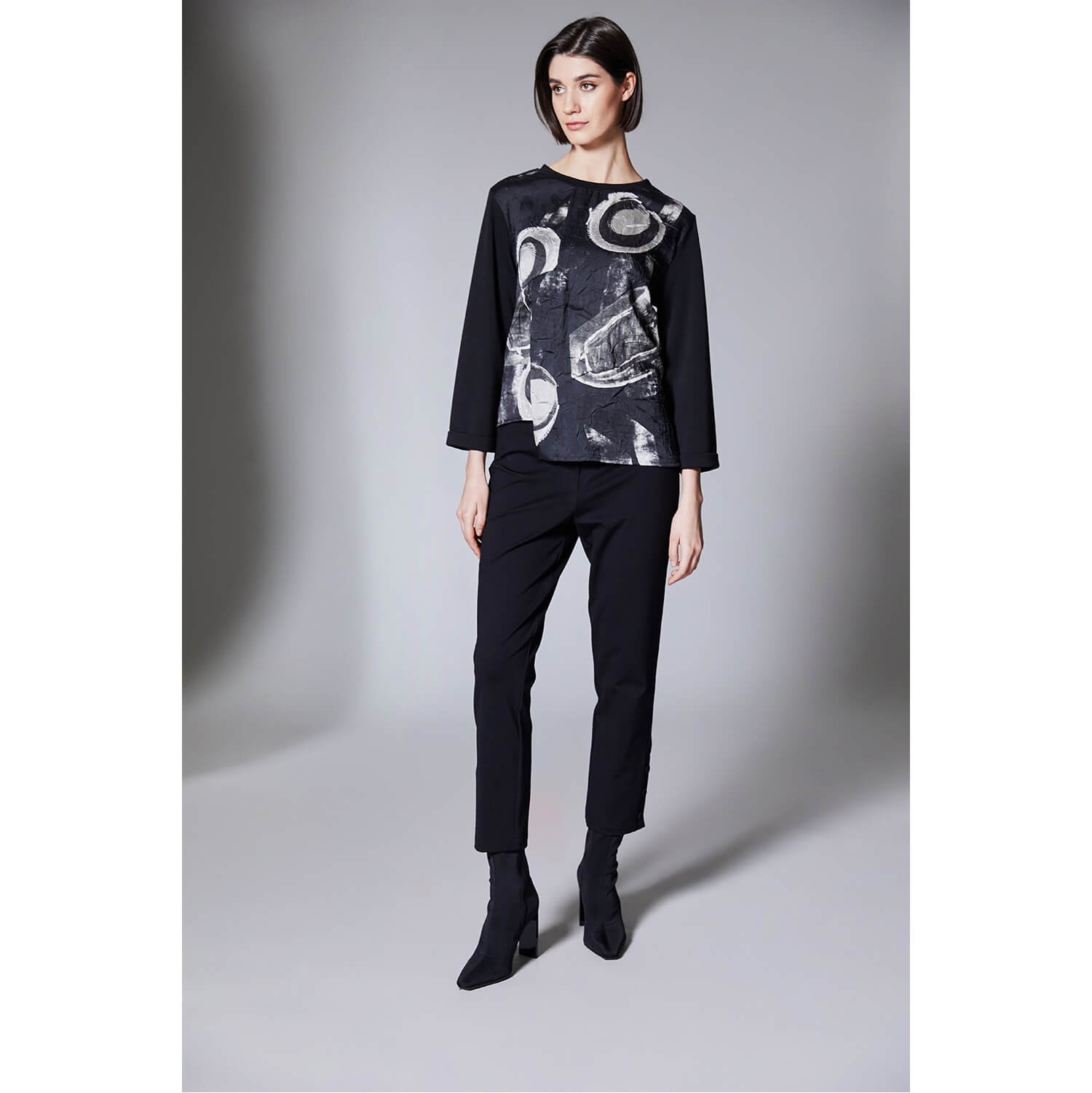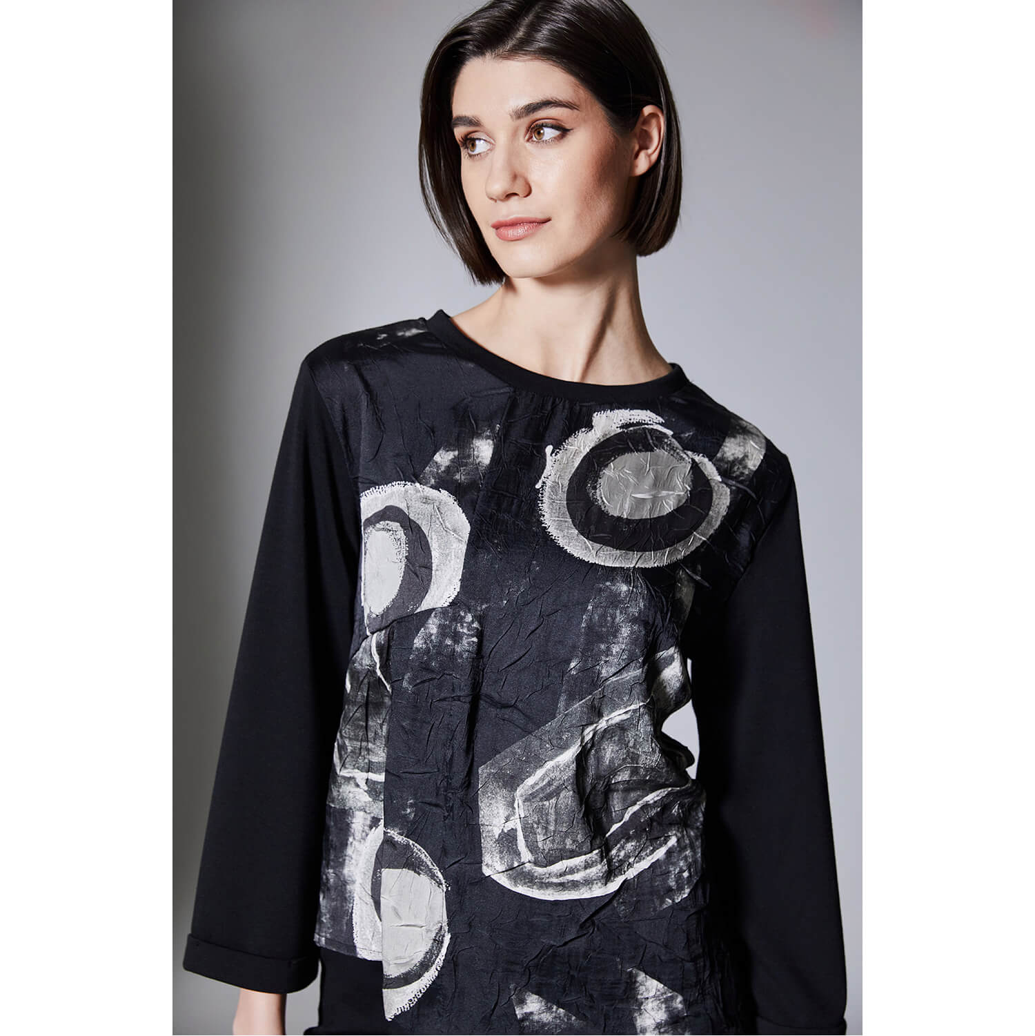 This Print top from the Peruzzi collection features a bold circular patterns, crinkled texture and modern abstract design.